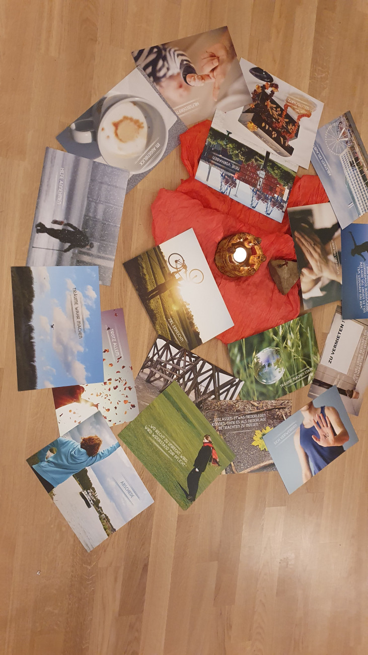 Sonja hatte zu unserer morgendlichen, schönen Runde wieder interessante Bilder mit Lebensthemen unterschiedlichster Art mitgebracht und – wie ihr auf dem Foto gut erkennen könnt – am Boden rund um unser Morgenlicht ausgelegt. Wir hatten zudem Besuch von Berenike und Miriam. Beide waren angenehm früh vor Ort, sodass wir noch vor unserem offiziellen Start um 7.15 Uhr ganz entspannt die Möglichkeit hatten, die vielen Themen in Ruhe auf uns wirken zu lassen.